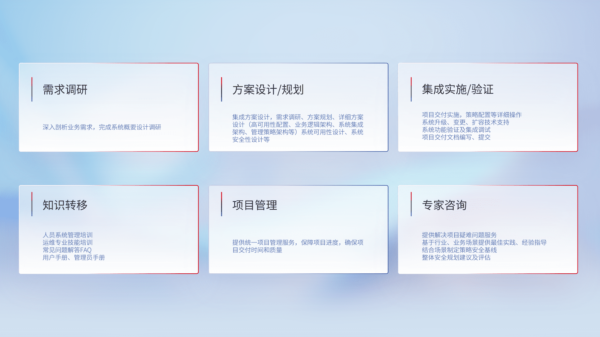 针对客户行业特性,,将宏观的安全战略和需求,,,,通过专业的交付服务,,实现项目落地,,为客户提供标准规范的集成交付服务。。。。